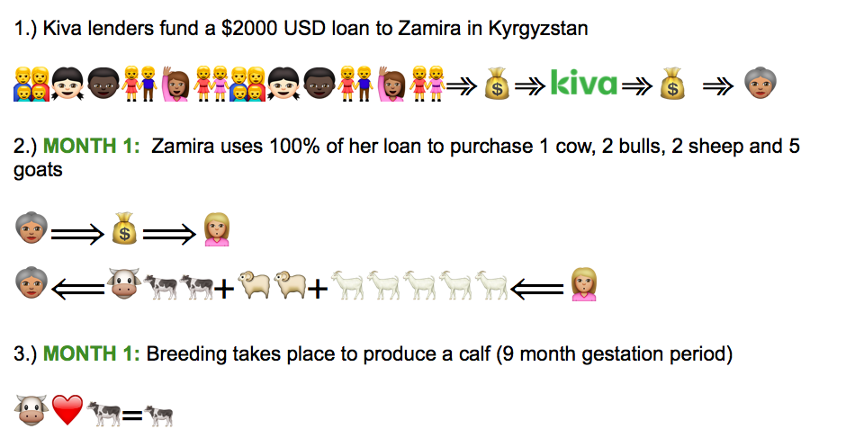 Before I reveal the answer based on my findings, it is important to understand how the livestock business works for a Kiva borrower in Kyrgyzstan. So, in the universal language of Emoji’s - here is the business cycle of a typical Kiva borrower in Kyrgyzstan (let's call her Zamira) who borrows $2,000 USD for a 12 month loan term: