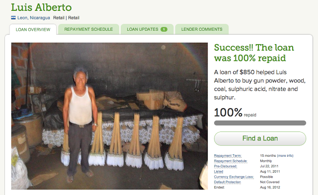 Luis Alberto blows things up for a living. He and his employees make fireworks, and his business has been financed in part by Fundación León 2000, the local Kiva partner. They’ve loaned Luis the equivalent of $850 to buy gunpowder, coal, sulfur, nitrate, and assorted kablowie necessities. Fundación León 2000, in turn, has financed Luis’s loan through Kiva. I’ve chipped in $25 here.