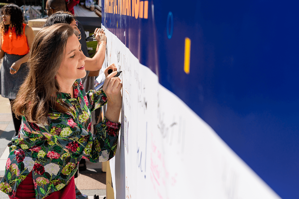 Kick-off event attendees write what a powerful woman means to them on the mural.