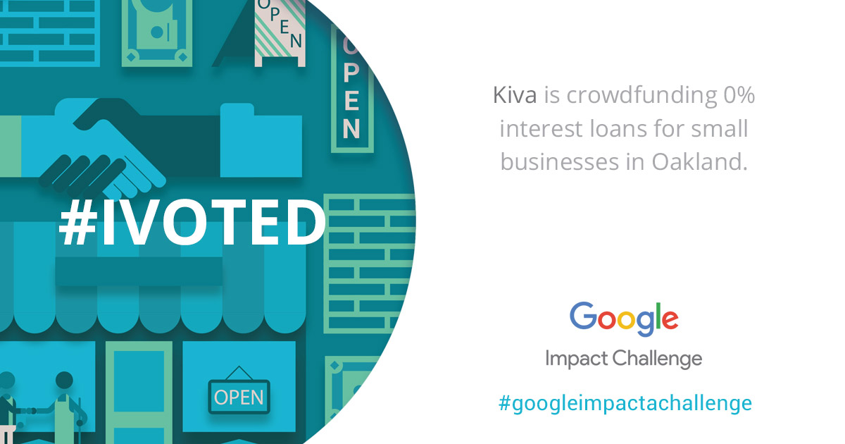 Oct. 5 -- Exciting news! Kiva Oakland is a finalist in the Bay Area Google Impact Challenge and could win $500,000 to grow more neighborhood businesses. Please vote to support Oakland's small business owners. Voting takes just 2 clicks and requires no registration or email!