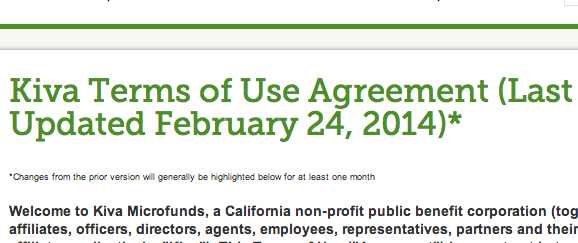 We’re always busy making tweaks to the site to improve the user experience. This process has led to information about our updates and terms of use being scattered in different places across the site. To make it easier to find information about Kiva's programs and features, we’ve updated our Terms of Use to reflect Kiva’s growth and our dedication to making our site serve our lenders’ and borrowers’ needs.