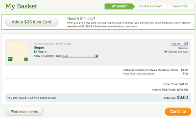 To help readability and reduce confusion, we've modified the placement and logic of the "Available Kiva Credit" that appears on the My Basket and Review & Pay pages. We previously displayed the user's total available Kiva credit that they had prior to completion of the transaction, regardless of whether any/all of that credit was being applied to the current basket.