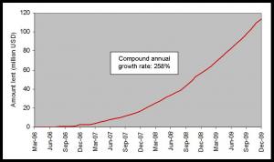 So what’s the point? One view is that every dollar still counts. Particularly since the global financial crisis has restricted the flow of credit to microfinance institutions around the world, another dollar of available financing means another dollar lent (this argument was less valid in 2007 and earlier, when cheap credit was readily available). What’s more, although still relatively small, Kiva is growing fast (see chart), even relative to the industry: it’s not inconceivable that ten years down the line online lending will make up a significant slice of the microfinance pie.